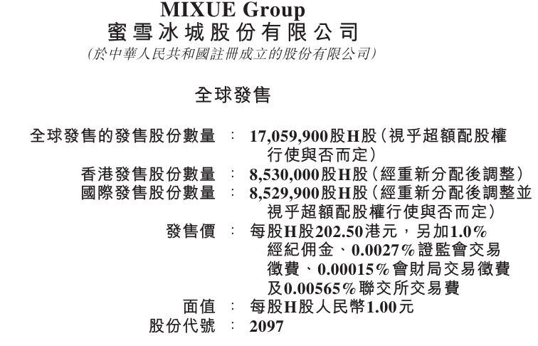 蜜雪集团:IPO最终价格为202.5港元/股正规股票配资开户蜜雪集团:IPO最终价格为202.5港元/股