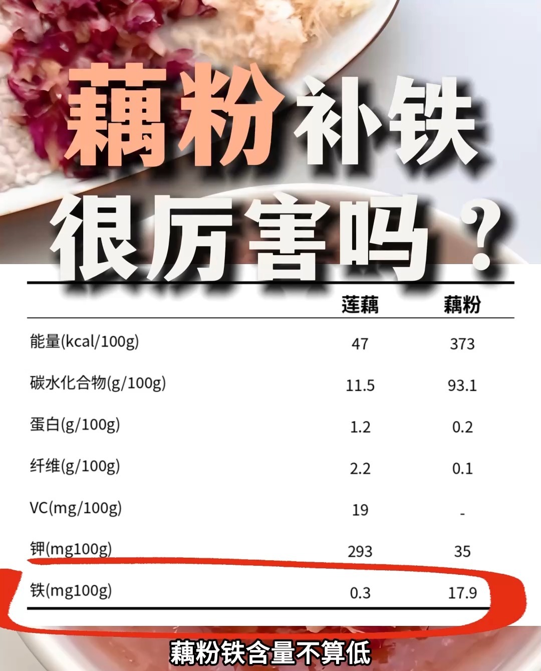 数据上看,藕粉铁含量不算低,但市面产品差异大。强化铁的会高一些,而纯藕粉的铁含量可能比较低。